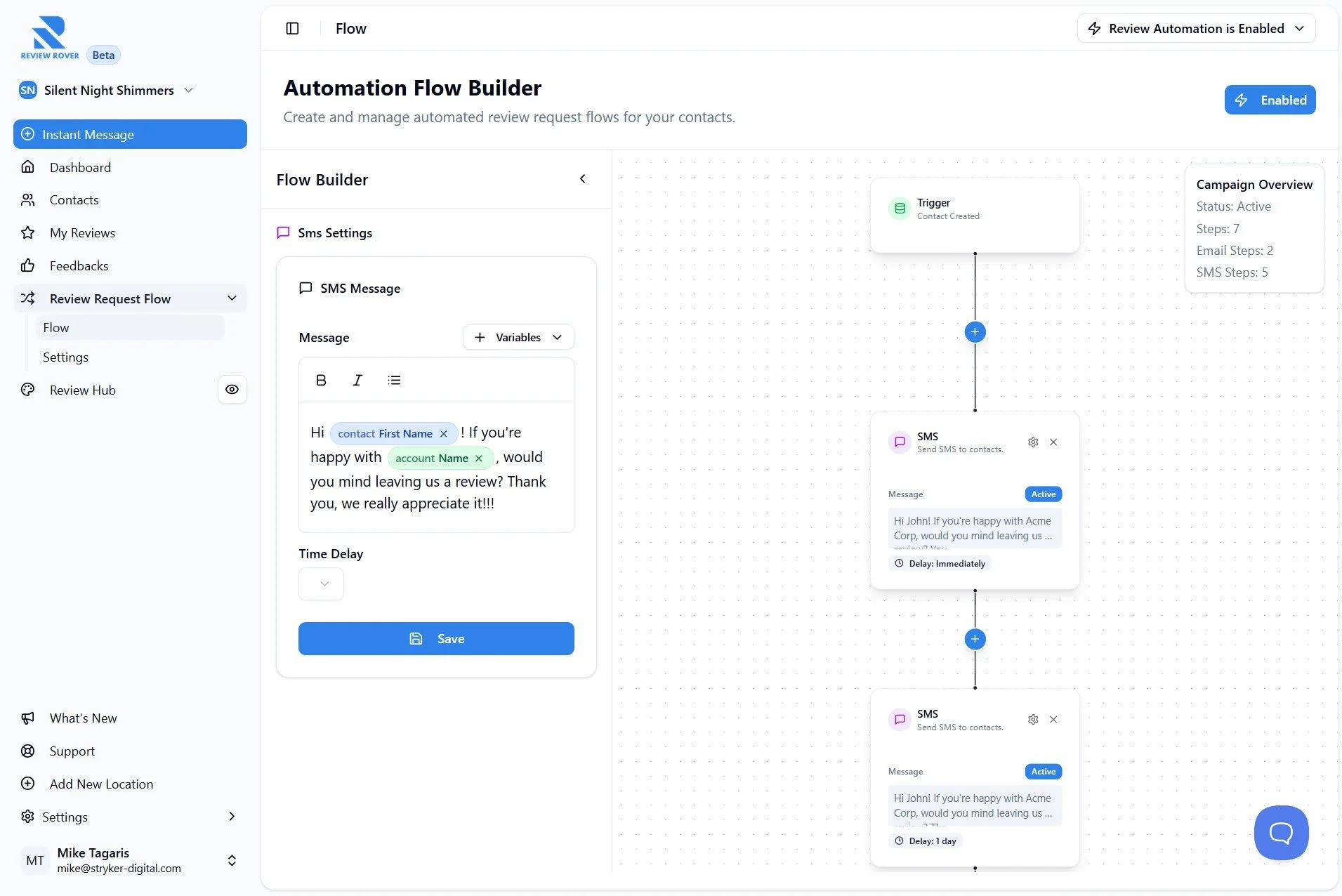 Account Manager - Once customers were live, I managed their success directly, monitoring campaign performance, identifying churn risks, and optimizing their review request flows. I created pause options, duplicate filters, and retention funnels to prevent customer loss and increase monthly review volume proactively.